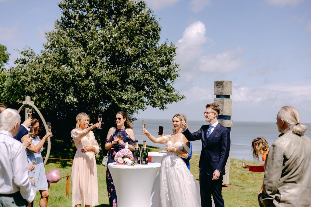 Nachdem das Ja-Wort gegeben war, trat die Gesellschaft ins Freie. Mit einem Glas Champagner in der Hand und der salzigen Meeresbrise im Gesicht genossen alle diesen einmaligen Weitblick. Es ist dieser Kontrast – die geschützte, historische Enge des Museums und die unendliche Weite der Nordsee direkt davor – der eine Hochzeit auf Sylt so unvergleichlich macht.