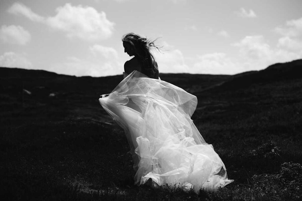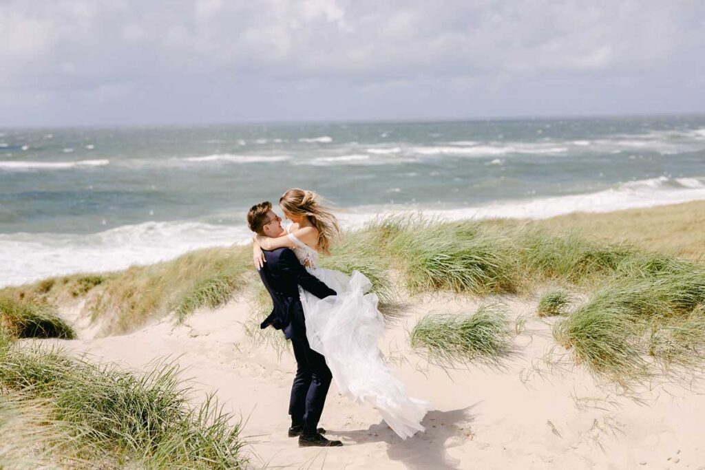 Zwischen den sanften Farbtönen der Dünen und dem dramatischen Sylter Wolkenhimmel entstanden Aufnahmen, die die Freiheit der Insel widerspiegeln. Besonders die Dünenhochkante bietet eine visuelle Tiefe, die das Paar förmlich über dem Strand schweben lässt. Es ist der perfekte Ort für Paare, die keine steifen Posen, sondern echte, lebendige Erinnerungen suchen.