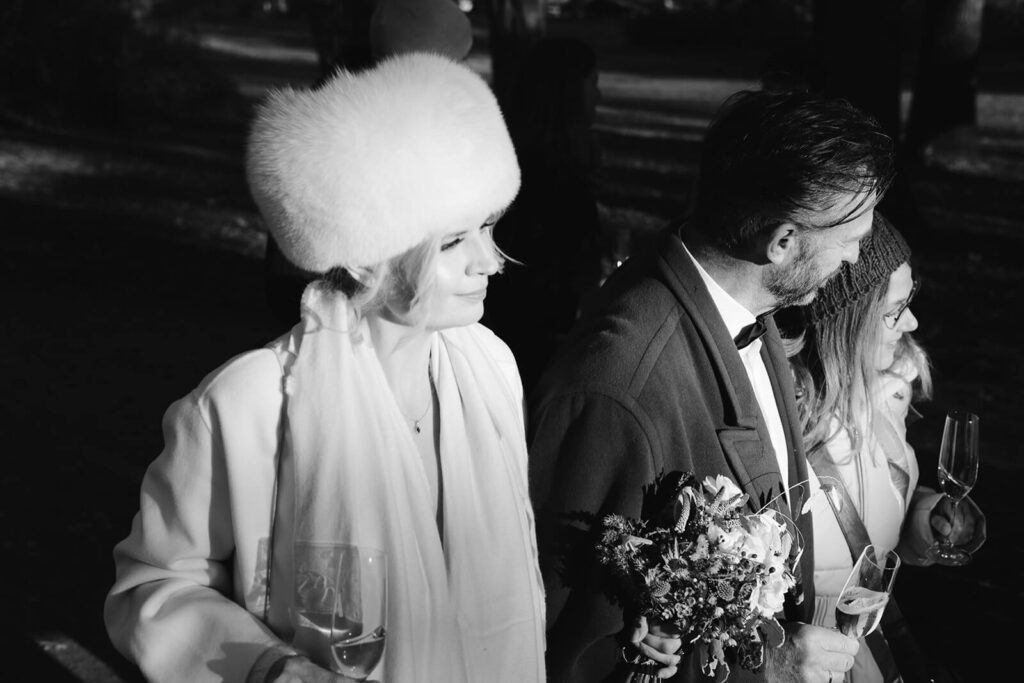 3. Details im Freien: Im Maschpark lassen sich wunderbar Details wie Schnee auf den Blumen des Brautstraußes oder der warme Dampf des Atems festhalten. Solche kleinen, saisonalen Elemente erzählen die Geschichte vom Heiraten im Winter eindrücklich.